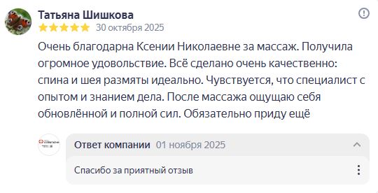 Очень благодарна Ксении Николаевне за массаж. Получила огромное удовольствие. Всё сделано очень качественно: спина и шея размяты идеально. Чувствуется, что специалист с опытом и знанием дела. После массажа ощущаю себя обновлённой и полной сил. Обязательно приду ещё