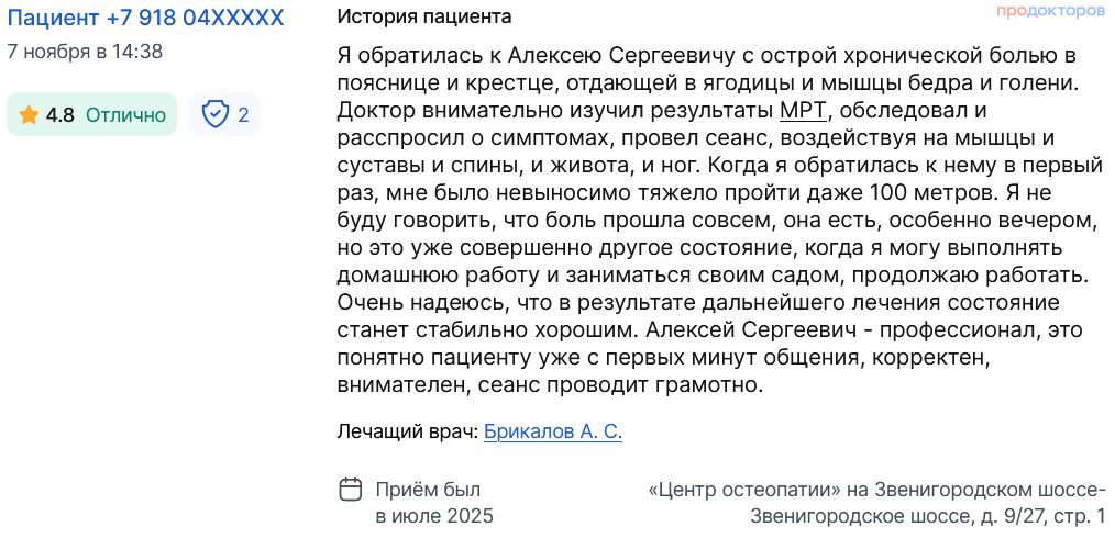 Я обратилась к Алексею Сергеевичу с острой хронической болью в пояснице и крестце, отдающей в ягодицы и мышцы бедра и голени. Доктор внимательно изучил результаты МРТ, обследовал и расспросил о симптомах, провел сеанс, воздействуя на мышцы и суставы и спины, и живота, и ног. Когда я обратилась к нему в первый раз, мне было невыносимо тяжело пройти даже 100 метров. Я не буду говорить, что боль прошла совсем, она есть, особенно вечером, но это уже совершенно другое состояние, когда я могу выполнять домашнюю работу и заниматься своим садом, продолжаю работать. Очень надеюсь, что в результате дальнейшего лечения состояние станет стабильно хорошим. Алексей Сергеевич - профессионал, это понятно пациенту уже с первых минут общения, корректен, внимателен, сеанс проводит грамотно.