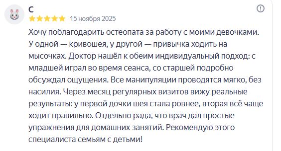 Я бы всем рекомендовала регулярно показываться остеопату, включая детей. Это очень мягкие, безболезненные техники (не то, что мануальная терапия!). Если проблема не запущена, то достаточно сходить один – два раза, а эффект впечатляющий.